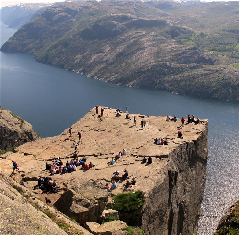 Aussichtsrestaurant auf einem Felsplateau überm Lysefjord klebt